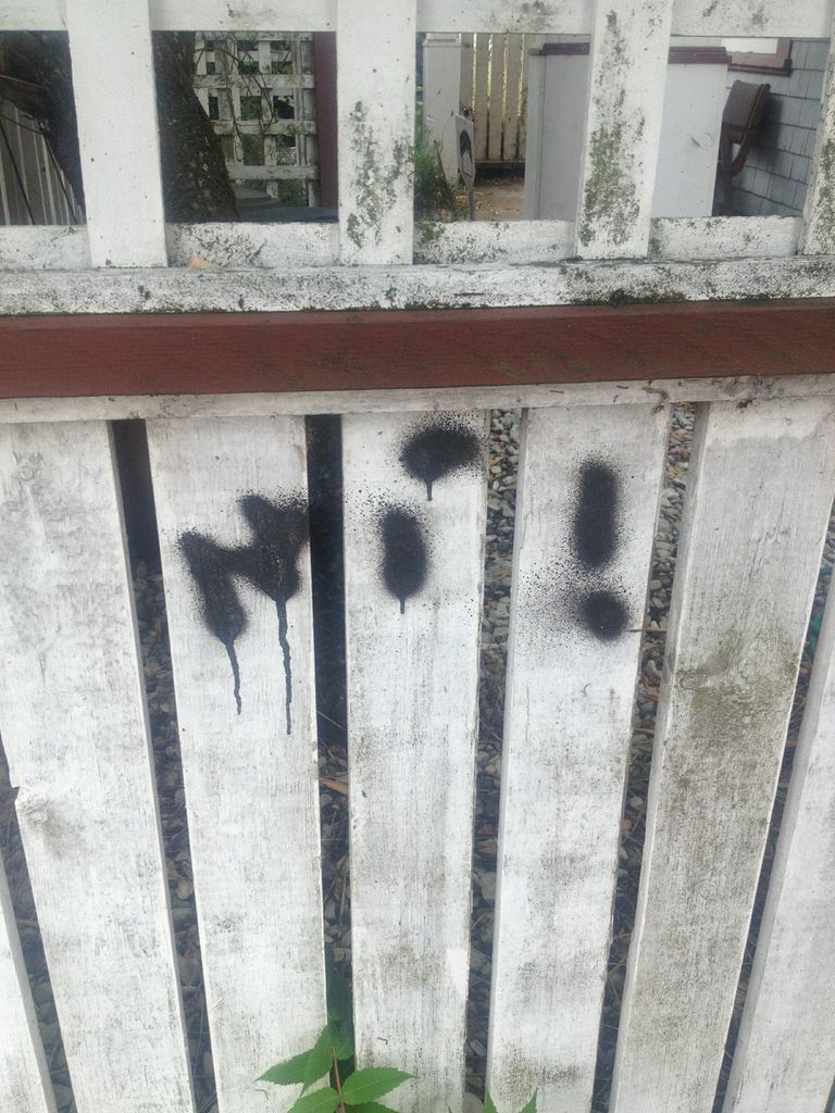 Ni!There’s some graffiti, a trail up Fitzwilliam one night; black spray paint on telephone poles, fences, and walls traced the hooligans’ path up the street. I think they were trying to write “hi!” on my fence, but it looks more like “ni!”, which reminds me of the Knights of Ni, which kindof pleases me. So I left it there. Comic relief.